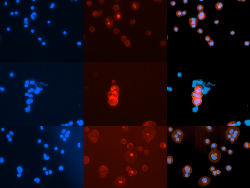 Image of HT-29 cancer cells following a cellular biology cryopreservation lab protocol in Spring 2025. Taken with EVOS microscope following DAPI and Texas Red staining. Property of my group.